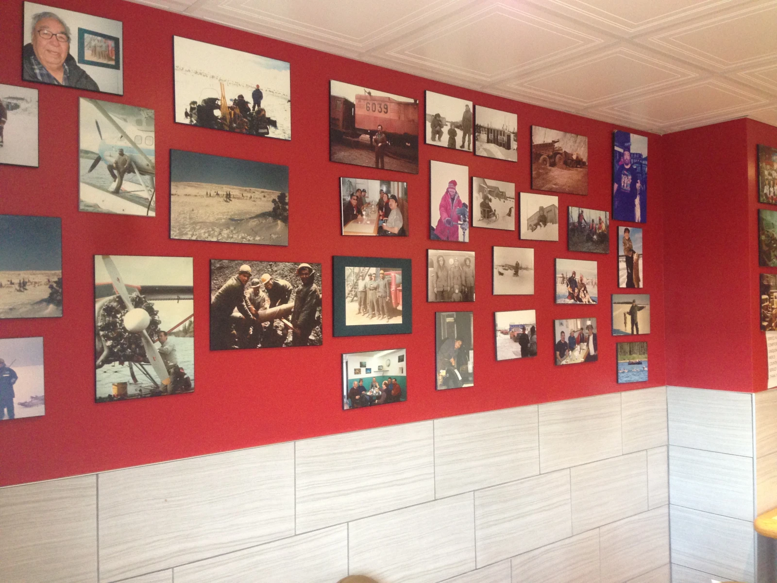 C’est pas mal là en fait qu’on lance les rumeurs, pis qu’on attend, le temps qu’elles reviennent. La place a été récemment rénovée, mais les photos qui décoraient déjà les murs à l’ouverture y sont toujours. Ceux qui reviennent sur place s’amusent à trouver les nouveaux cadres parmi ceux qui sont devenus familiers. Photos du quotidien, d’incidents d’avion ou à la mine, de trophées de pêche ou de chasse, des disparus… tout y passe.