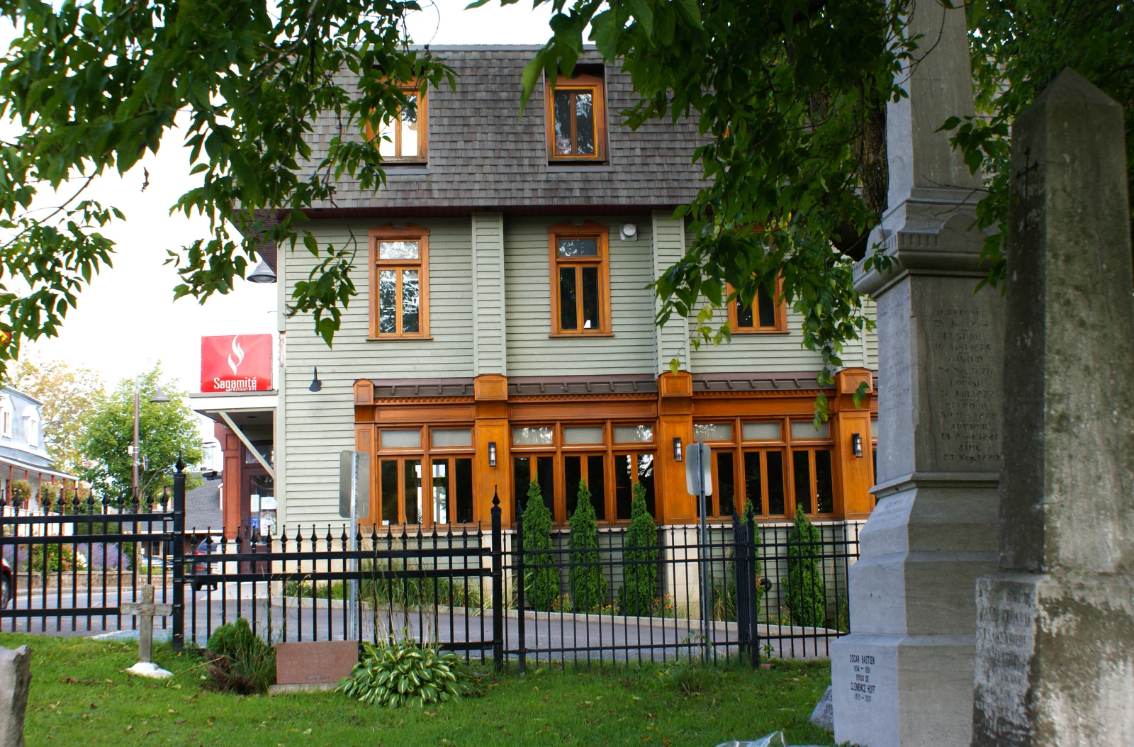 De là, on aperçoit le siège de la mission précédemment citée, l’église Notre-Dame-de-Lorette. Les gens de l’extérieur appellent ça une chapelle, mais ici, on a toujours dit « l’église ». Mon grand-père était catholique, pis c’était acquis que si je dormais chez lui la fin de semaine, je devais me pointer à la messe de 11h le dimanche matin. J’ai changé de parcours religieux depuis, mais je dois dire que le bâtiment garde son charme, ne serait-ce que pour sa valeur patrimoniale. De chaque côté de l’église, on trouve des cimetières où résident tous nos Ancêtres qui sont partis vers le pays de l’Ouest au cours des 300 dernières années. On y trouve aussi un restaurant. Quand j’étais ado, c’était un casse-croûte rétro, Chez Yvan 1954. On y mangeait des pains chauds pour 50 cennes pis on flânait en attendant la bus (dans le temps, on n’en avait rien à cirer que c’était un mot masculin, « bus »). Le casse-croûte à Yvan n’est plus là, c’est devenu le restaurant Sagamité, avec cuisine inspirée de la tradition pis des sacrés bons déjeuners (je recommande le nid de canard). Les visiteurs n’ont pas l’air trop troublés par la vue qui donne sur un cimetière. Moi, ça me rend serein. Le lien avec les Ancêtres est quelque chose d’important, ici. Ils font partie de nos vies. Je suppose que c’est rassurant, cette continuité. Un peu comme Nancy, la sympathique serveuse qui y travaille depuis l’époque du casse-croûte.