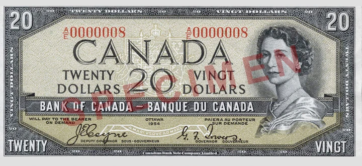 Billet de 20$ : Sa Majesté la reine Elizabeth II qui détient depuis 2015 le plus long règne de l’époque moderne au Canada.