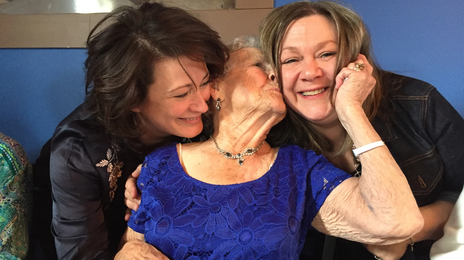 Sur la photo : les 100 ans de Rollande. Avec ma sœur Roxanne. Quand je te dis qu’on s’embrasse beaucoup, chez nous… :)