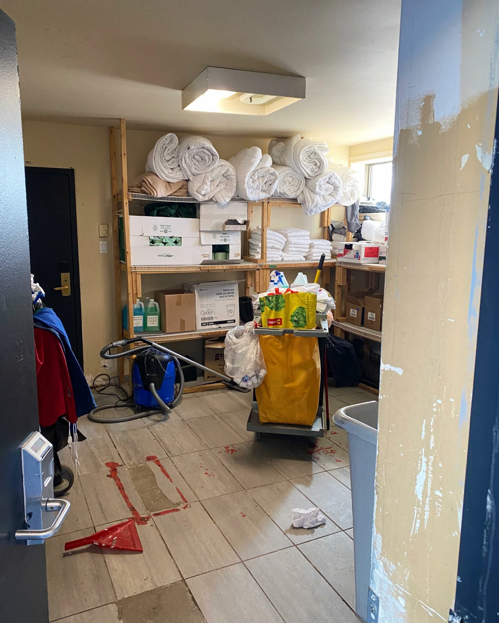 Un homme vêtu d’un habit de construction tourne la clé dans la porte de la chambre voisine après sa journée d’ouvrage. Un gros chien et un chat l’accueillent. « J’attends de déménager, mais je pense que tu pourrais trouver mieux qu’ici, pour 1500$ par mois », me conseille-t-il. « Mais si tu as un voisin trop bruyant, tu peux demander de changer de chambre », ajoute-t-il avec empathie.