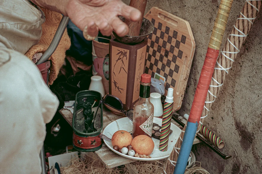 Des guirlandes scintillantes servent de rideau d’entrée, tandis qu’à l’intérieur, des livres, des fragments épars et des babioles trouvées dans les ruelles s’entassent. C’est la saison, le quartier déborde de monticules de restants d’appartements. On retrouve dans ce bric-à-brac énigmatique un autel d’offrandes, des pyramides de fruits et des installations comme cette boîte pour bagues contenant deux billes et deux capsules de canettes.