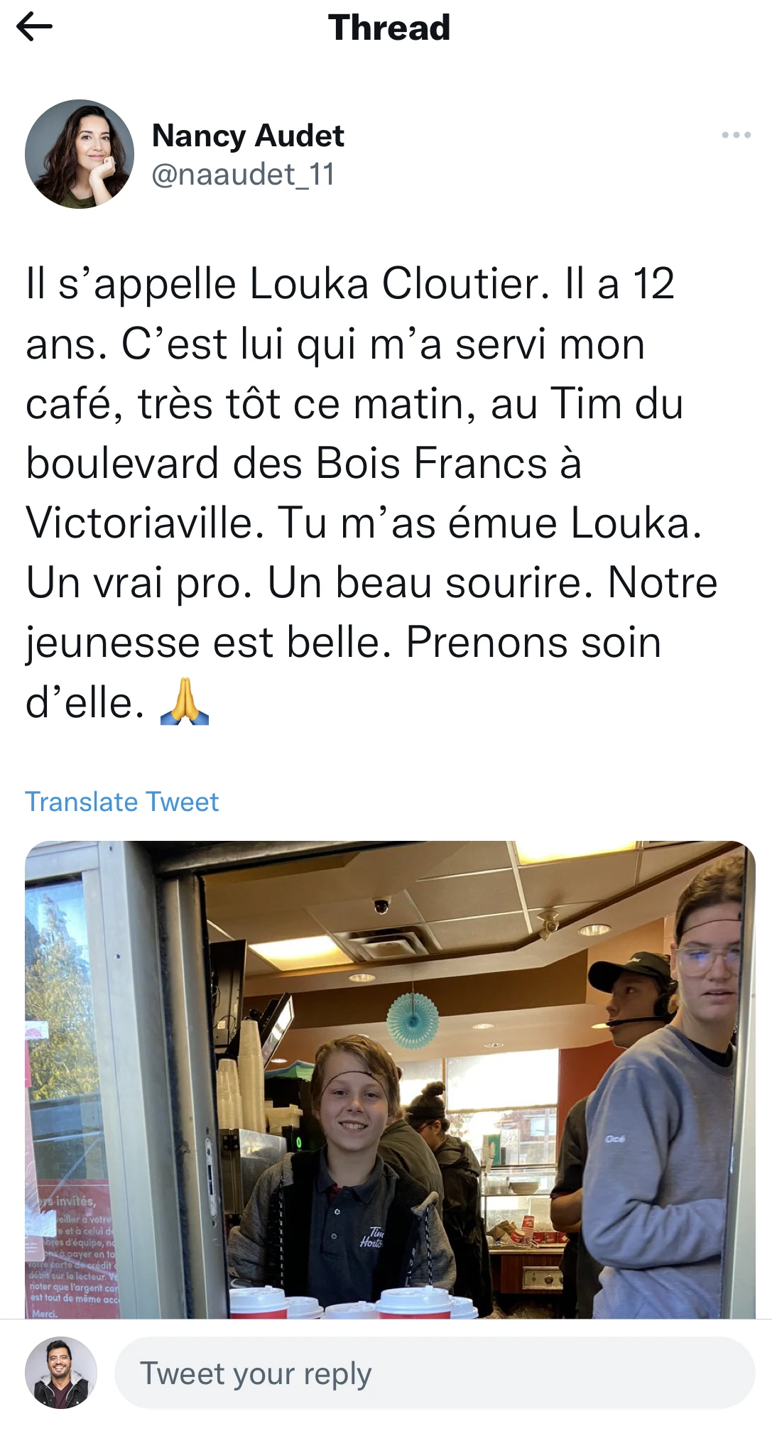 Bien que je suis sincèrement content pour les gens qui ont vécu cette combinaison idéale de conditions, je ne veux pas que ça soit la norme de travailler à 12 ans. Je serais attristé qu’on s’habitue à voir des enfants de 12 ans derrière un comptoir.