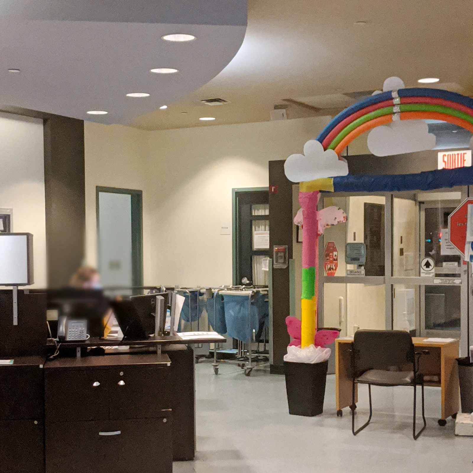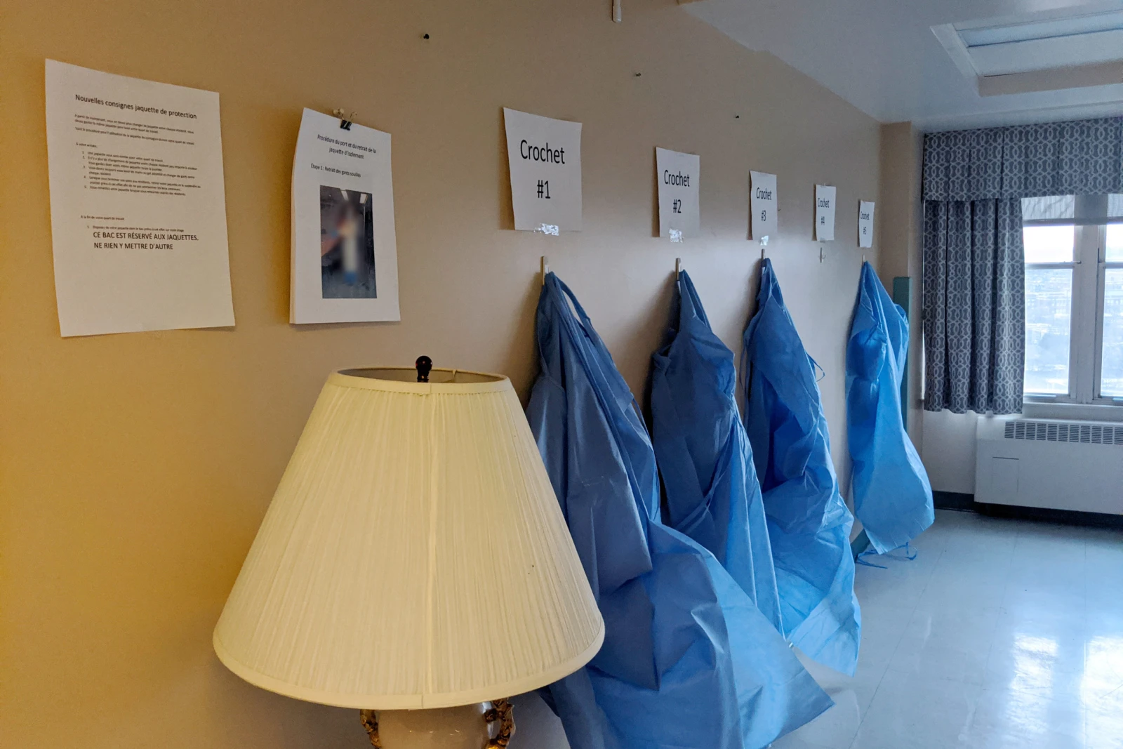 Je prends une minute pour regarder autour de moi. L’endroit ressemble à un hôpital et offre un spectacle désolant. Les couloirs sont vides, les seules personnes qui s’y aventurent sont les employés vêtus de leur combinaison d’astronaute. On se trouve sur un étage «jaune», sans cas de COVID. Les étages rouges sont ceux où il y a des cas confirmés, les oranges, ceux où on soupçonne qu’il y a des cas, et les étages arc-en-ciel sont ceux où il y a un peu des trois (c’est le cas du 9e et du 11e).