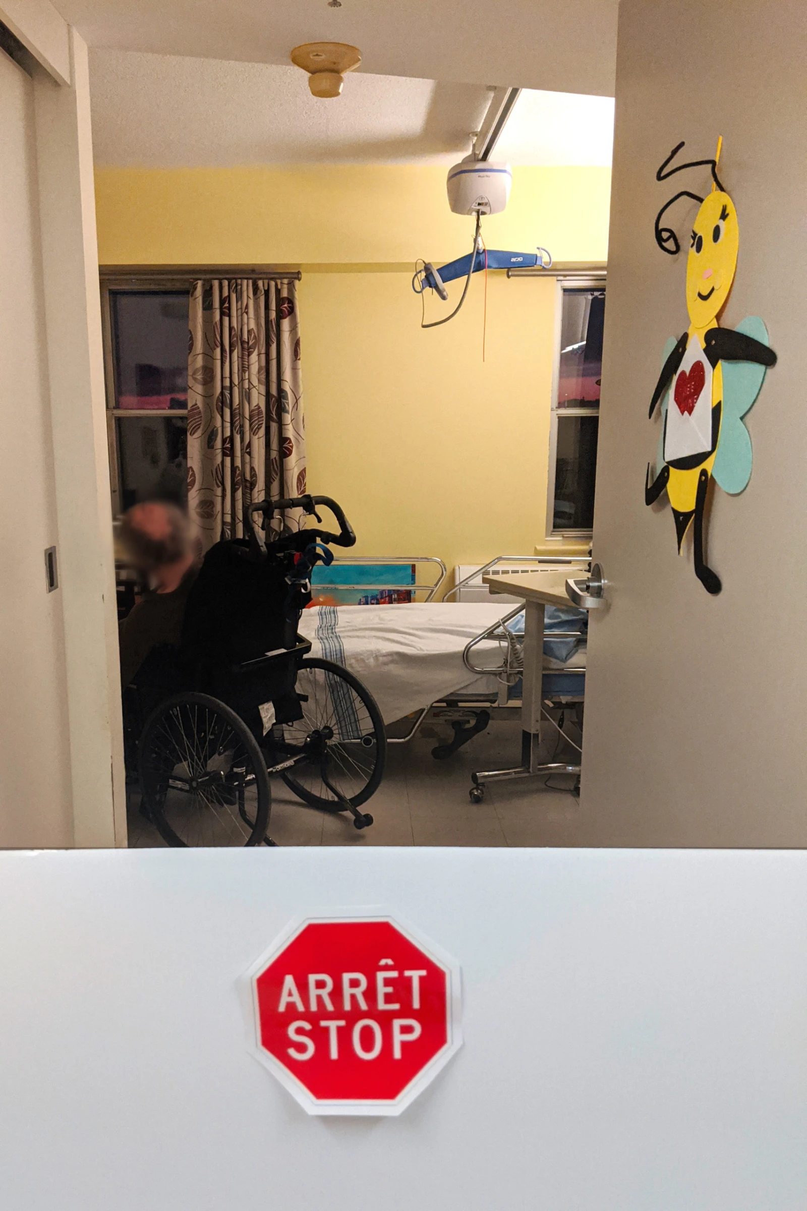 « La résidente de la chambre 1202 sera probablement la prochaine à nous quitter », me glisse Albert, un infirmier en médecine familiale sur place pour une durée indéterminée. J’apprends qu’elle ne mange plus et reçoit des soins de confort, qu’elle est loin de sa famille. «On est en terrain miné. On a beau faire tous les efforts, chaque jour on raye des noms de la liste des résidents », confie Albert.