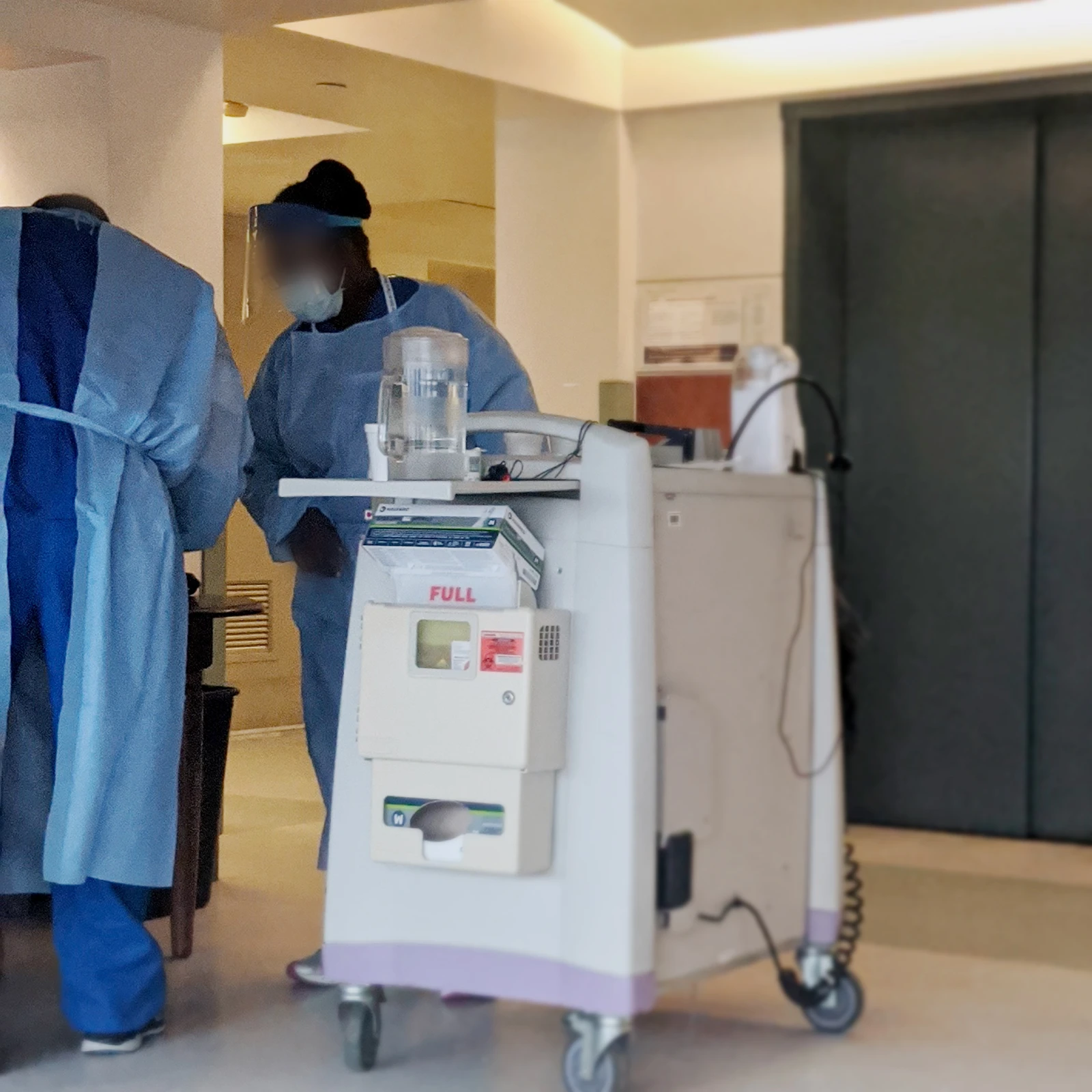Dès mon arrivée, la scène qui se dessine sous mes yeux me laisse perplexe. Dehors, un infirmier fume dans l’uniforme bleu officiel fourni par le gouvernement. Un autre employé également vêtu de la combinaison anti-COVID-19 s’affaire à déplacer des poubelles. «Personne ne doit sortir à l’extérieur avec son kit», martelait pourtant François la veille en énumérant les règles de base. Bientôt, je comprendrai que tout le monde, y compris moi, fait son gros possible en essayant de suivre au mieux des consignes qui changent chaque jour.