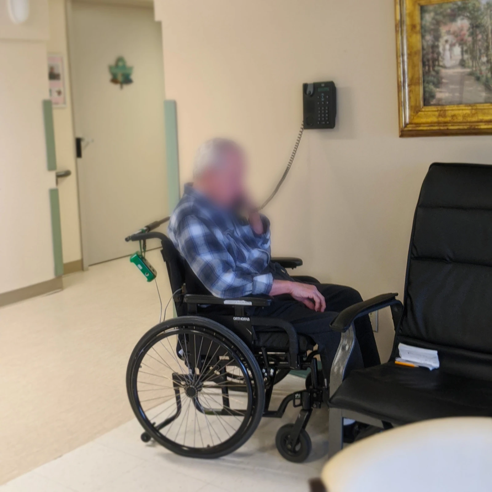 Sa chambre «jaune» se situe dans un couloir «rouge». Discrètement, son bras sort du cadre de porte, c’est sa façon de m’inviter à aller le visiter. « J’irai au paradis, parce que l’enfer j’en reviens», peut-on lire sur son chandail. Je ne peux m’empêcher de penser que l’enfer, il le vit actuellement en CHSLD, privé de ses proches et de ses repères.