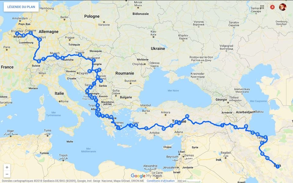 J’ai parcouru à peu près 9000 km. J’ai traversé dans l’ordre la Belgique, l’Allemagne, l’Autriche, la Hongrie, la Serbie, la Bosnie, le Monténégro, l’Albanie, la Grèce, la Turquie et enfin, je suis arrivée en Iran. C’est à Van, tout à l’est de la Turquie, que j’ai pris le train pour arriver à Tabriz, ville située dans la province d’Azerbaïdjan au nord-ouest de l’Iran.