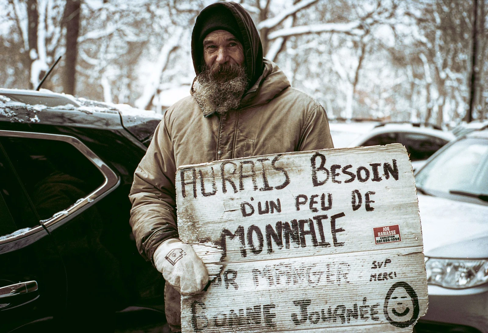 Michel soulève son affiche aux abords d’un coin de rue très prisé par la mendicité. Papineau et Sherbrooke. C’est son angle depuis 2004. « Dix-huit ans que je suis ici chaque jour, de 11 h à 14 h, précise-t-il. Après, c’est un autre Michel qui prend le relais. On fait notre shift dans le respect. »