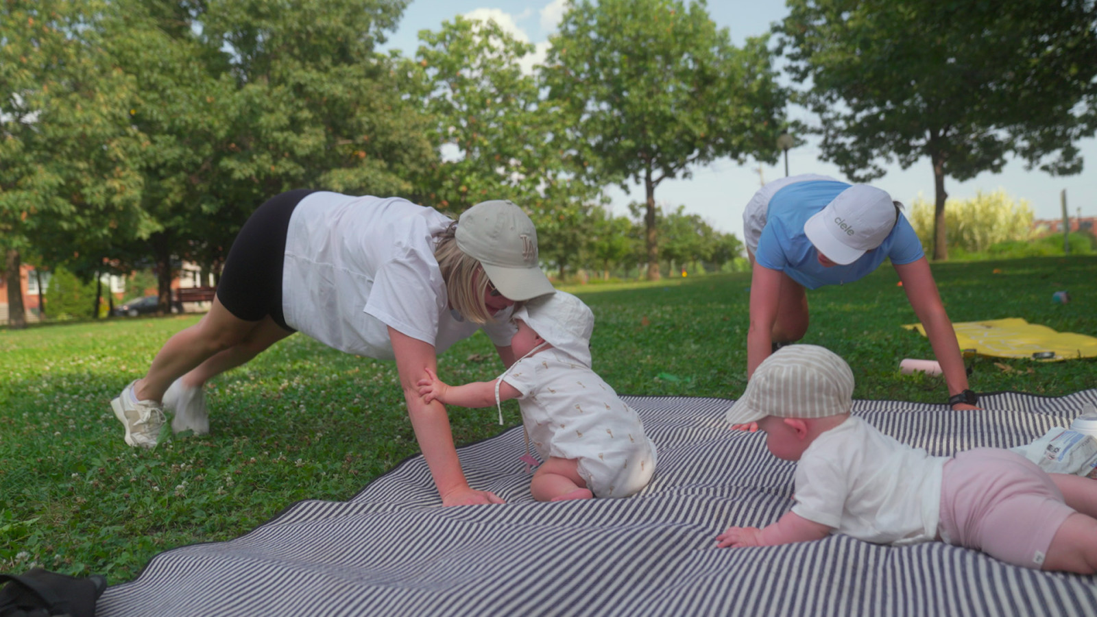 Entre des intervalles et des squat avec bébé dans les bras, des moms de tous les horizons se retrouvent chaque semaine pour le cours parent-bébé. C’est une classe d’une heure qui met de l’avant un entraînement fonctionnel (des exercices qui entraînent le corps pour les activités effectuées dans la vie quotidienne). Les classes ont lieu beau temps, mauvais temps. Une mère nous a d’ailleurs confié que des orages ont fait annuler deux cours de suite cet été et que ça a eu une incidence sur son moral.