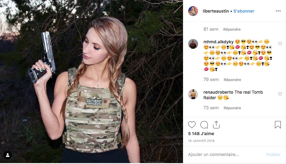 Liberte Austin a commencé à s’intéresser aux armes après avoir été victime d’un cambriolage qui a mal tourné. « Après ça, je vivais dans la peur, pendant plusieurs années », explique-t-elle. « Puis j’ai commencé à chasser. Avoir une arme entre les mains, ça m’a redonné un sentiment de pouvoir, de contrôle sur ma vie ». Instagram, elle l’utilise avant tout comme un moyen d’exprimer ses opinions, ses passions… dont les armes et Donald Trump.